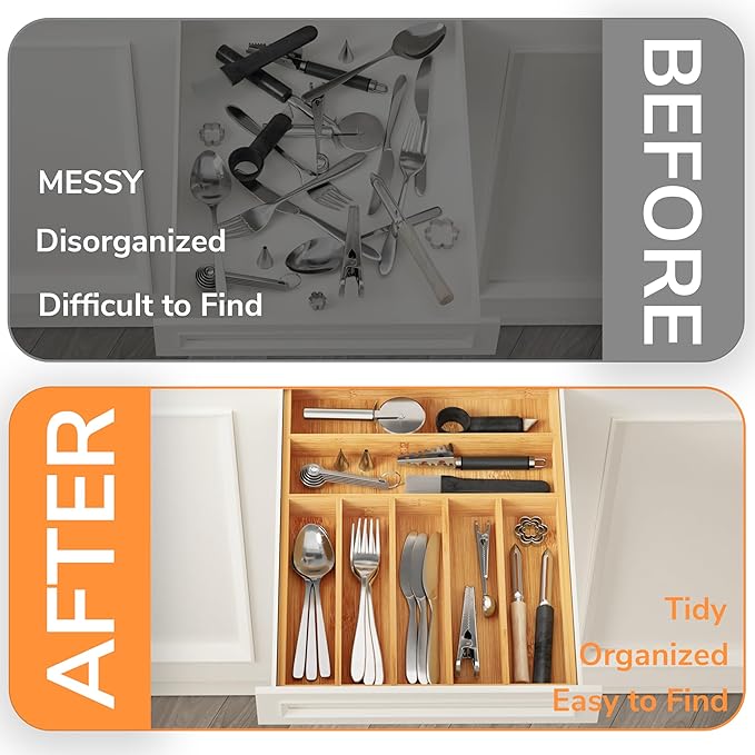 - Not Just for Drawer Storage: The silverware drawer organizer is versatile, not only does it excel in drawer organization, but it is also the perfect solution for desktop organization, making it easy to find and adding to the beauty of your desktop at the same time