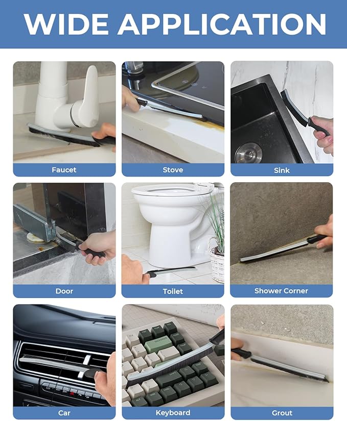 - Multi-purpose Brush: Our cleaning brush is suitable for cleaning various surfaces such as sinks, window tracks, blinds, door tracks, faucets, cars, stoves, grout lines, basins, floors, keyboards, bathtubs, vents, drains, swimming pools, vehicles, furniture, boats, countertops, microwaves, coffee machines, shower door frames, fans, shoes, sneakers, ovens, washing machines, toilet tank floors, the seam between the toilet bottom and toilet lid, the gaps in carved furniture, outdoor brick seams, etc.