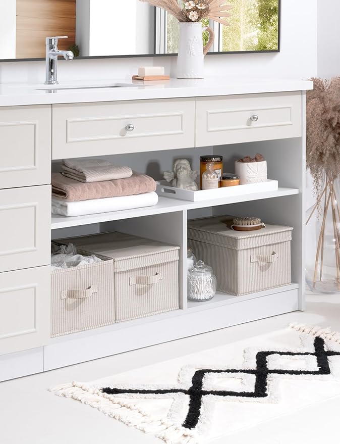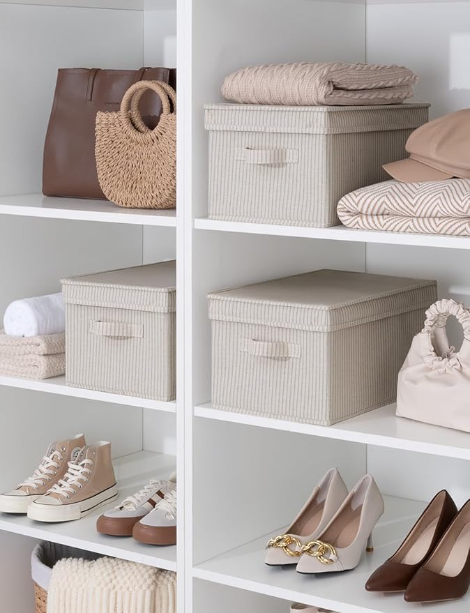 StorageWorks Large Storage Bins with Lids, Decorative Storage Boxes with Lid and Handles, Foldable Storage Baskets for Closet, Shelves, Stackable, Khaki Stripe, 3-Pack