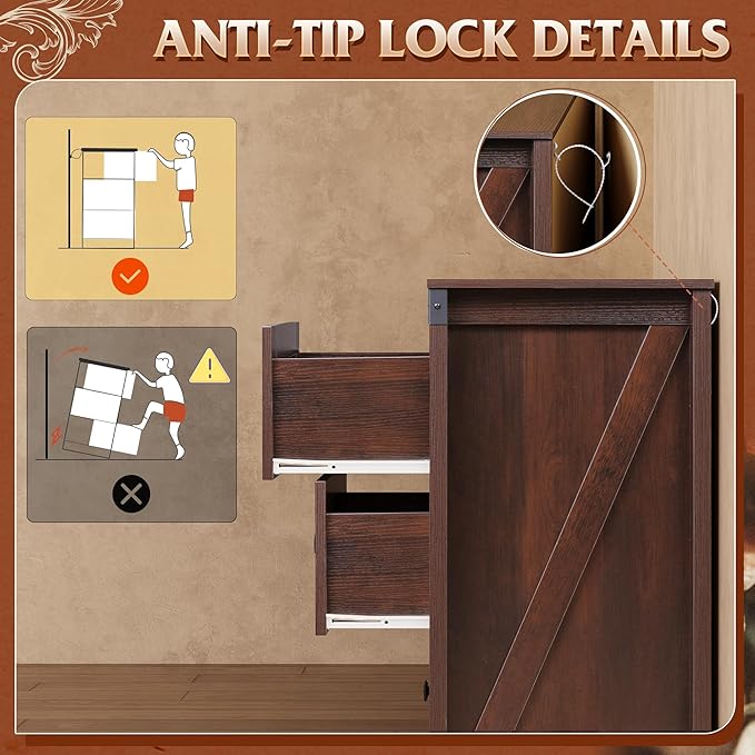 - đăFarmhouse 6 Drawers DresserăThis wooden dresser farmhouse look is heightened by the rustic color finish coupled with the side barn sign and the dark square handle adds a rustic charm. It can be used for bedroom clothing organizer, entryway table, decorative storage for living room.