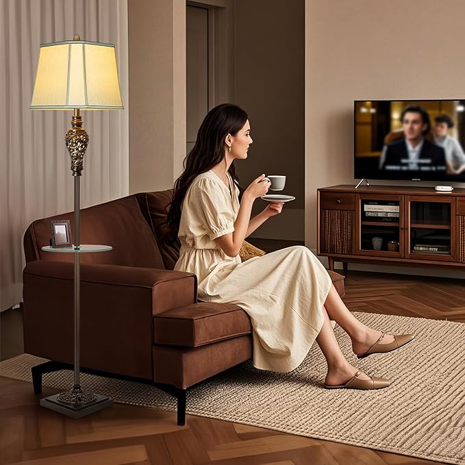 - STURDY GLASS TRAY: The 12" round tray is made of tempered glass, which is sturdy and easy to clean. Combining the functions of floor lamp and side table to save space in the room. You can place your phone, coffee mug, books or decorations, etc.