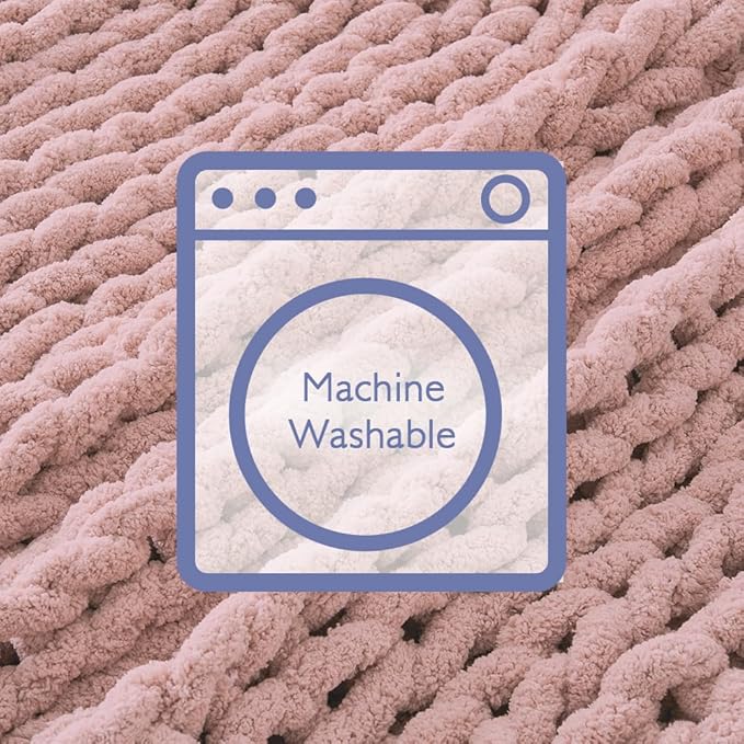 Bigacogo Chunky Knit Throw Blanket for Couch, 40x80 inches, 100% Hand Knitted with Thick Jumbo Chenille Yarn, Cozy Soft Large Rope Knot Cable Crochet Blankets for Sofa Bed Living Room, Dusty Pink