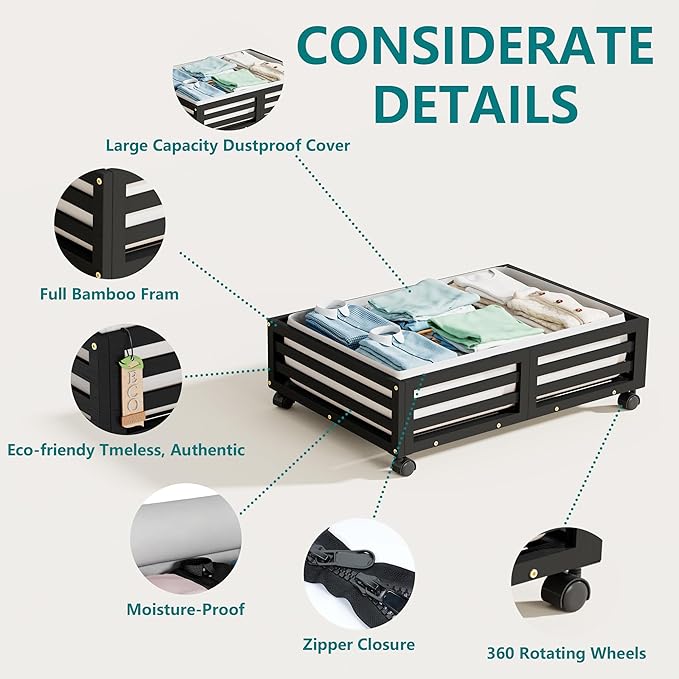 - π[Sturdy and Durable] Our under bed storage with wheels is crafted from premium wood bamboo, boasting 4 rotating wheels and a capacity of 120lbs. This 'under bed storage' solution includes non-woven bags for efficient organization of clothes, books, shoes, and toys.