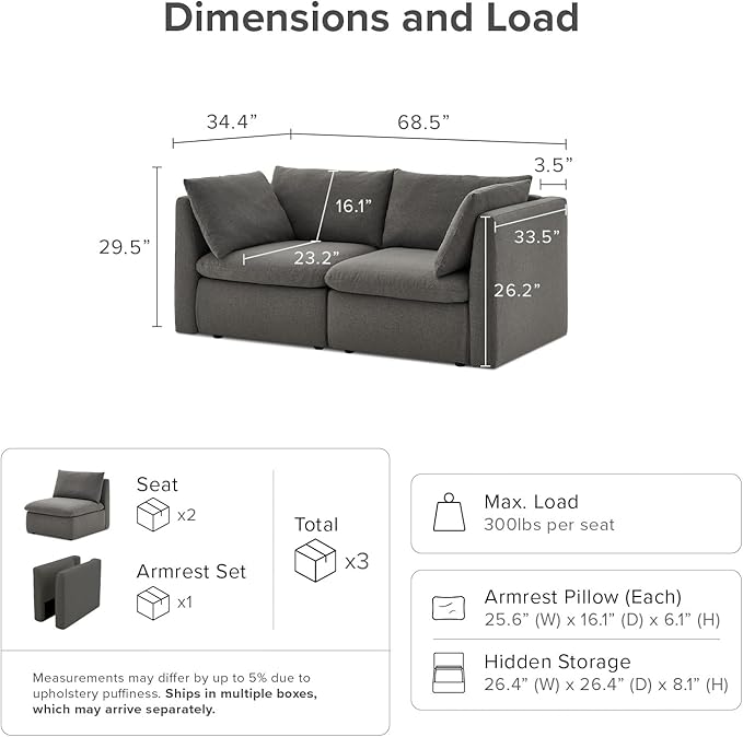 - Disclaimers: Colors may vary due to lighting and screen differences. Cushions are vacuum-packed and may take up to 7 days to fully expand. For best results, gently fluff and allow time to reach full volume. Measurements may differ by up to 5% due to upholstery puffiness. Ships in multiple boxes, which may arrive separately