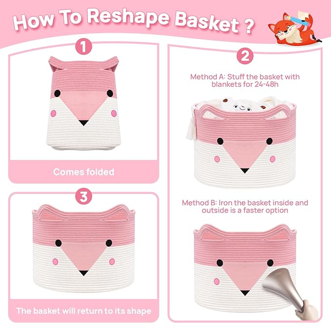 - 【Note】The baby blanket baskets arrive folded, but please don’t worry—this is not a quality issue. You can check out the videos we uploaded. Fill it with blankets and quilt in 24 to 48 hours to make it look round. Then iron the creased places inside and outside the basket. It'll get back to its best shape. This is a basket you’ll use for years. We’ve put a lot of care and love into designing these baskets, and you can trust the quality and craftsmanship.
