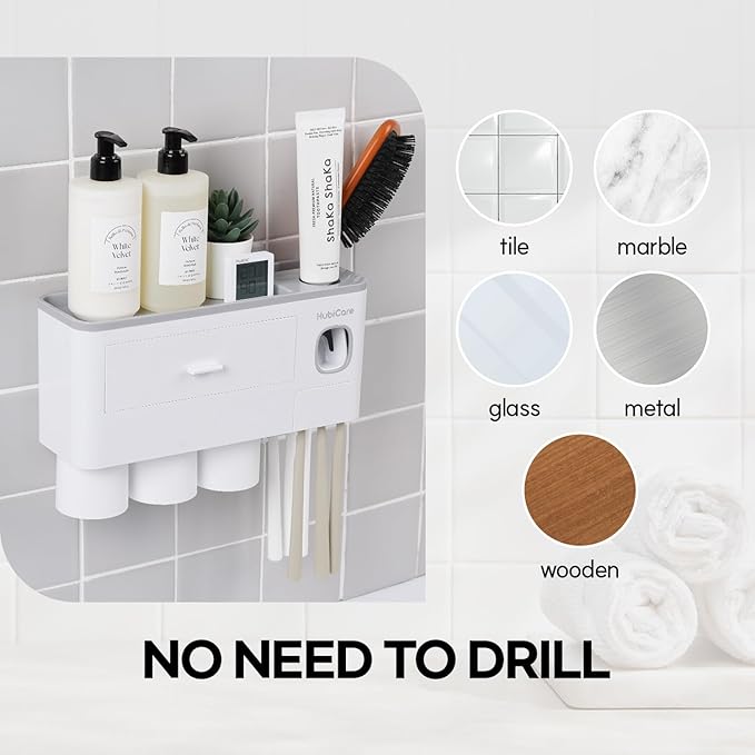 - ✅【Easy Maintenance and Convenient Cleaning】 The HubiCare toothbrush holder is made of waterproof material, so you don't have to worry about water damage, and there is a drain hole at the bottom to keep it ventilated and dry. Both the wall toothbrush holder and the wall-mounted toothpaste dispenser can be easily disassembled for convenient cleaning. The toothbrush dispenser is suitable for all toothpaste tubes with a hole diameter of 1-1.2cm (0.39-0.47in).