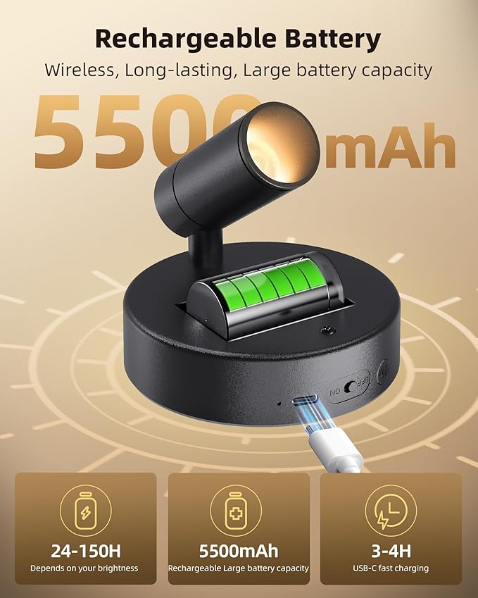 - 5500mAh Rechargeable Spotlight: The EZVALO plant spotlight indoor features a powerful 5500mAh rechargeable battery, Provide up to 150 hours of low brightness and 24 hours of high brightness lighting.Using the equipped USB-C fast charging, Battery operated spot light can be fully charged within 4 hours, providing cordless, long-lasting 100 lumens glare-free lighting,Very suitable for indoor plant lighting and picture lighting
