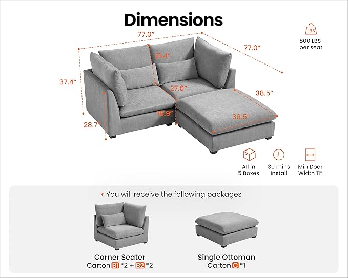 - 【Shipped in Five Packages for Easy Setup】To enhance your convenience, the sectional will be delivered in five packages, allowing for easier handling and assembly. Each package is carefully packed to ensure safety during transit, and while they may arrive at different days, rest assured that our professional customer service is ready to assist you with any concern. The thoughtful design makes the setup process simpler and more efficient,ensuring you enjoy your sectional without any hassle