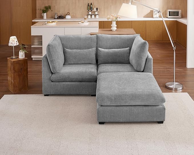 Oversized Modular Sofa, Extra Deep Cloud Chenille Sectional Couch with Ottoman Chaise, Fluffy Chenille Loveseat L Sofa for Living Room, Villa (Loveseat+Ottoman, Chenille Grey)