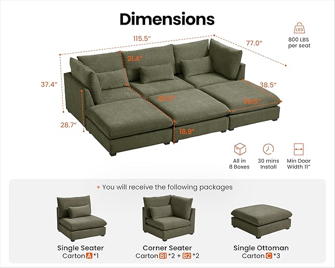 - 【Shipped in Eight Packages for Easy Setup】To enhance your convenience, the sectional will be delivered in eight packages, allowing for easier handling and assembly. Each package is carefully packed to ensure safety during transit, and while they may arrive at different days, rest assured that our professional customer service is ready to assist you with any concern. The thoughtful design makes the setup process simpler and more efficient,ensuring you enjoy your sectional without any hassle