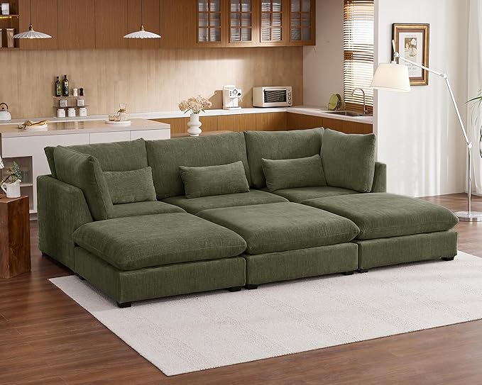 Oversized Modular Sofa, Extra Deep Cloud Chenille Sectional Couch with Ottoman Chaise, Fluffy Chenille 6 Seater Couch Bed for Living Room, Villa (Sofa Bed 6 Seater, Chenille Green)