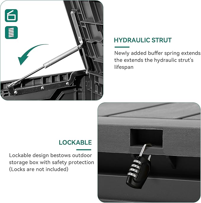 - Convenient Design: The resin outdoor storage features hydraulic struts for smooth, slow, and safe opening and closing, with dual side handles for effortless movement, whether by yourself or with a friend