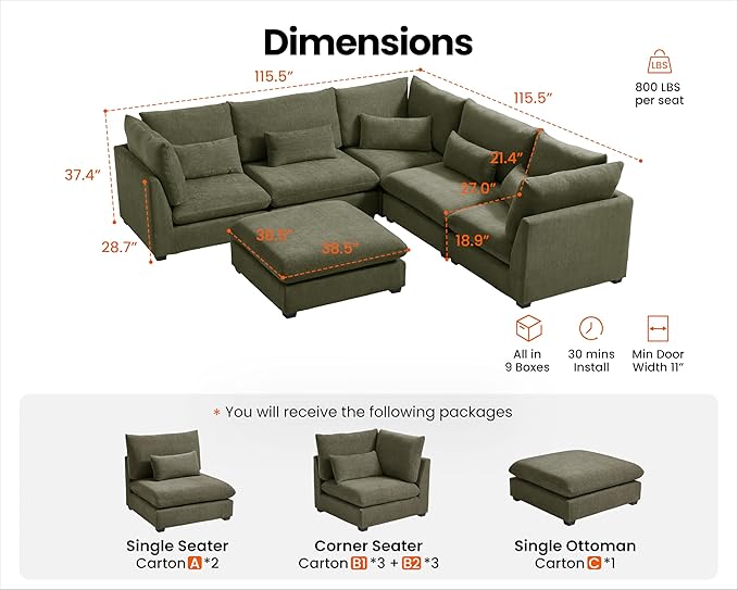 - 【Shipped in Nine Packages for Easy Setup】To enhance your convenience, the sectional will be delivered in nine packages, allowing for easier handling and assembly. Each package is carefully packed to ensure safety during transit, and while they may arrive at different days, rest assured that our professional customer service is ready to assist you with any concern. The thoughtful design makes the setup process simpler and more efficient,ensuring you enjoy your sectional without any hassle