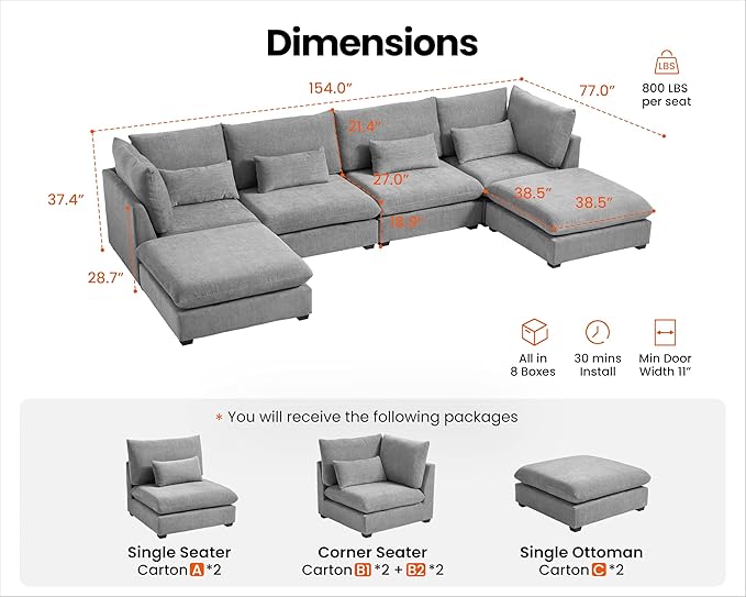 - 【Shipped in Eight Packages for Easy Setup】To enhance your convenience, the sectional will be delivered in eight packages, allowing for easier handling and assembly. Each package is carefully packed to ensure safety during transit, and while they may arrive at different days, rest assured that our professional customer service is ready to assist you with any concern. The thoughtful design makes the setup process simpler and more efficient,ensuring you enjoy your sectional without any hassle