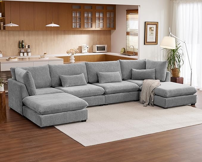 Oversized Modular Sofa, Extra Deep Cloud Chenille Sectional Couch with Ottoman Chaise, Fluffy Chenille 6 Seat U-Shaped Sofa for Living Room, Villa (U Shape 6 Seater, Chenille Grey)
