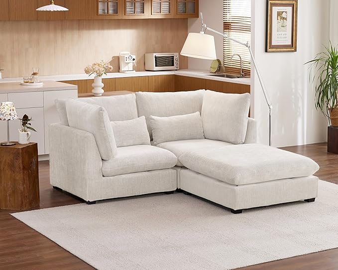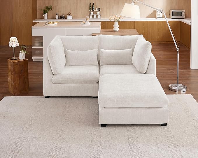Oversized Modular Sofa, Extra Deep Cloud Chenille Sectional Couch with Ottoman Chaise, Fluffy Chenille Loveseat L Sofa for Living Room, Villa (Loveseat+Ottoman, Chenille White)