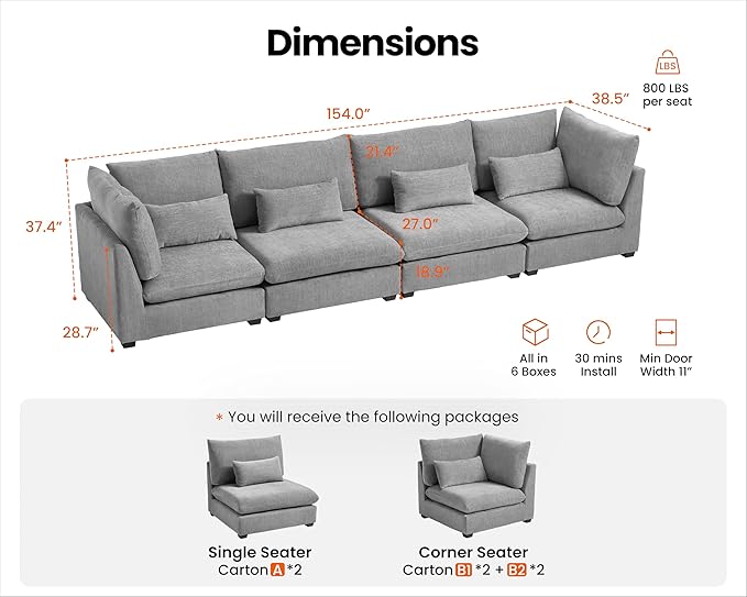 - 【Shipped in Six Packages for Easy Setup】To enhance your convenience, the sectional will be delivered in six packages, allowing for easier handling and assembly. Each package is carefully packed to ensure safety during transit, and while they may arrive at different days, rest assured that our professional customer service is ready to assist you with any concern. The thoughtful design makes the setup process simpler and more efficient,ensuring you enjoy your sectional without any hassle