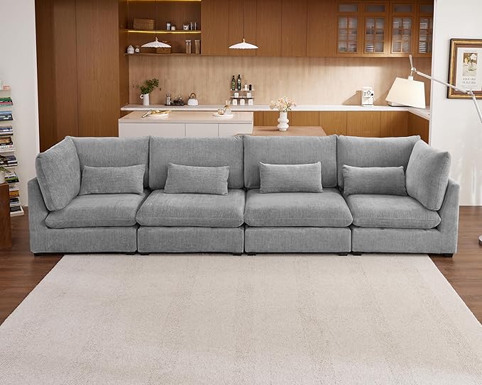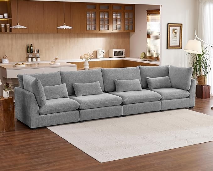 Oversized Modular Sofa, Extra Deep Cloud Chenille Sectional Couch with Ottoman Chaise, Fluffy Chenille 4 Seater Sofa for Living Room, Villa (Basic 4 Seater, Chenille Grey)