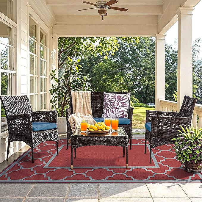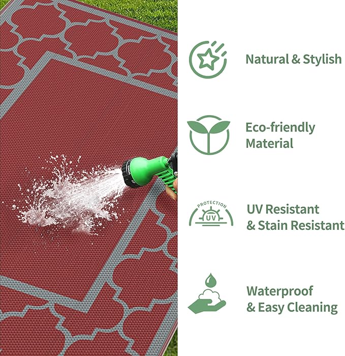 - Upgraded Materials & Reversible Use:GENIMO's outdoor plastic straw rug, crafted from recyclable polypropylene, features eye-catching patterns and is fully reversible. Waterproof and durable, it's an ideal choice for patios and outdoor relaxation, especially as part of your camping essentials. Thanks to the upgraded weaving process, whether used on one side or the other, it seamlessly integrates with the outdoor environment, bringing joyful moments.Also perfect as a fall outdoor rug