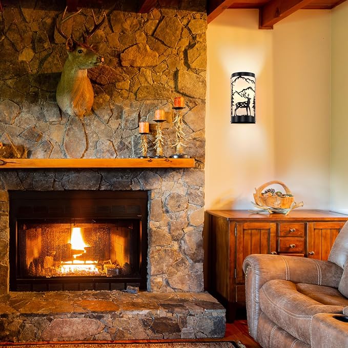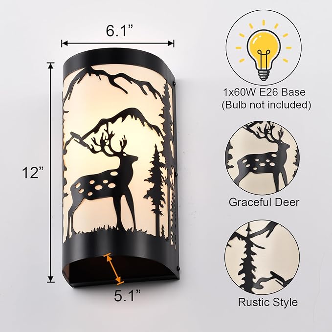 - Rustic Design: Farmhouse wall sconces set of two is crafted from durable matte black metal,featuring intricate forest elements and a deer silhouette,white parchment paper adds a soft,warm glow,enhancing industrial aesthetic of the vintage wall sconce