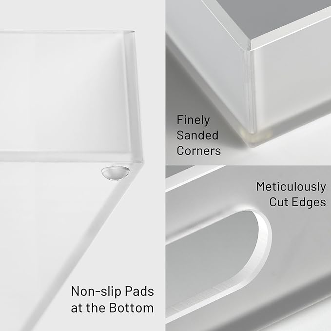 - SECURE & STABLE: Our acrylic tray is designed with silicone anti-slip pads to protect surfaces from scratches and provide stability. With these pads in place, the tray remains steady on various countertops, preventing any sliding or movement.
