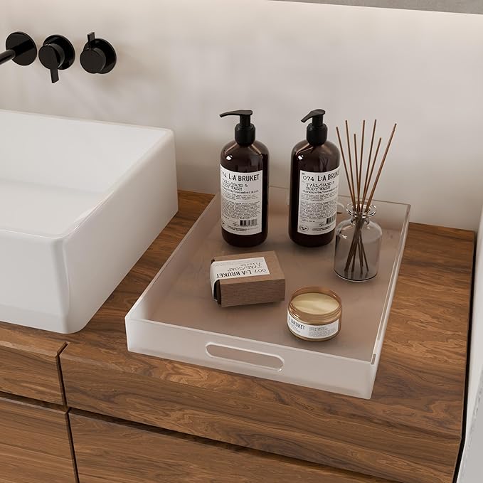 Large Acrylic Serving Tray Decorative Ottoman Coffee Table Vanity Tray Tea Fruit Platter Snack Appetizer Dessert Drink with Handles for Bar Kitchen Party, Frosted