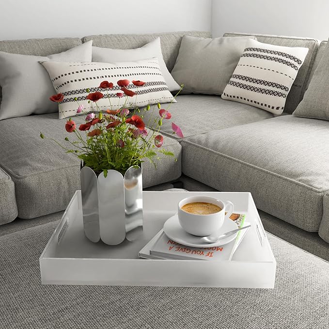 - MULTIPURPOSE ORGANIZER: Our tray can hold coffee, food, tea, fruit, snacks, appetizers, desserts, and drinks at the bar, kitchen, or party according to your needs. Additionally, it can also function as a vanity tray for bathroom, counter, or dresser tops while doubling up as an organizer for remote controls, magazines, makeup, toiletries, and more. Its adaptable design makes it a suitable addition to kitchens, bathrooms, vanity areas, and bars.