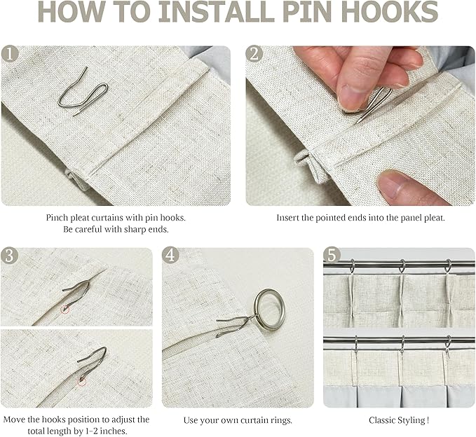 - Multiple Hanging Ways:The luxury curtain have many hanging options to meet your different home dΓ©cor needs:back tabs(4 inch),clip rings,ring hooks or for track system. Please note that 18 hooks are in the package but clips and rings are not included.Two weighted hems sewn at bottom increase the draping effect.Moving the pinhooks position to adjust the total height by 1-2 inches