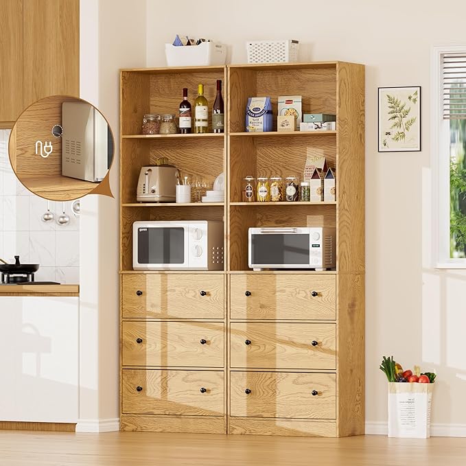 - 【71" Tall Bookcases Set of 2】- Two large bookcases with 3-tire open shelves and 3 drawers is made of high-quality particleboard, waterproof and scratch-resistant. Equipped with anti-tipping iron plate, the natural bookcases are more stable to use