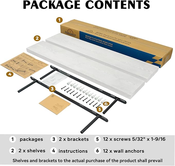 - EASY TO INSTALL: These floating shelves come with stainless steel galvanized invisible brackets, toggle bolts for drywall, and simple instructions to help you install them. These wall shelves are easy to assemble, requiring only two boards and the necessary screws and hardware. We also provide detailed instructions for quick and easy assembly