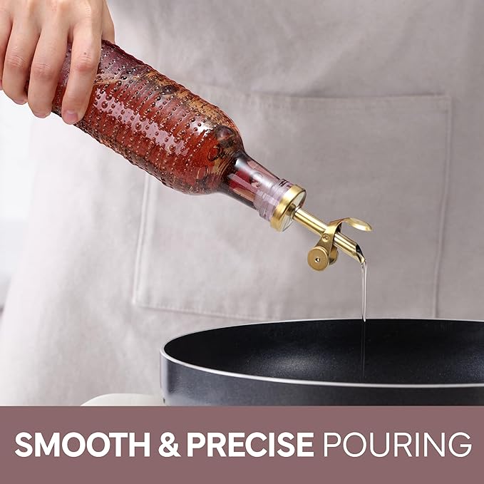 - Beautiful and Functional - Our colored glass oil dispensing bottles, with elegeant colors, gold tops and gold wire rack, will elevate your kitchen. Don't use just any oil bottle, upgrade the way you cook. That's our mission.
