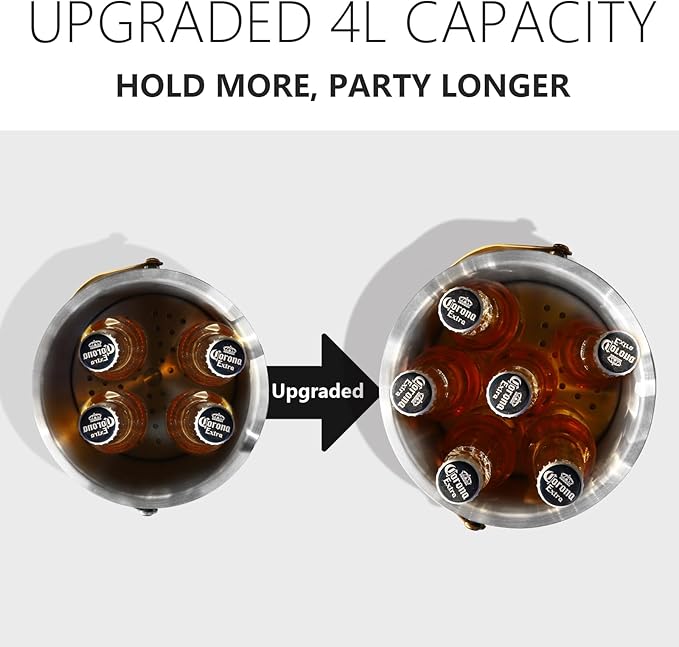 - PARTY PERFECT CAPACITY: This upgraded 4L ice bucket is large enough for parties, home bars, picnics, BBQs, beaches, patios, restaurants, pool parties, weddings, graduations, and more. Keep cocktails, wine, champagne, whiskey, vodka, beer, and soda perfectly chilled. Stay cool this summer with our ice bucket for parties with lid