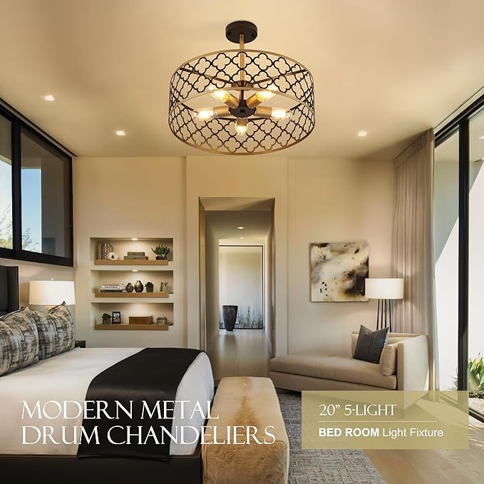 5-Light Drum Chandeliers for Dining Room,19.7" Rustic Farmhouse Dining Room Light Fixture, Black&Gold Metal Hanging Pendant Light for Living Room Bedroom Kitchen Entryway Foyer