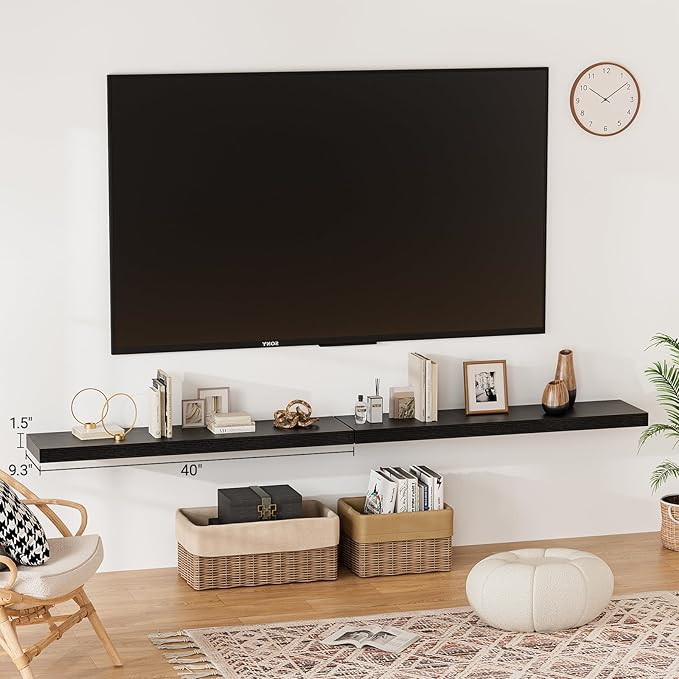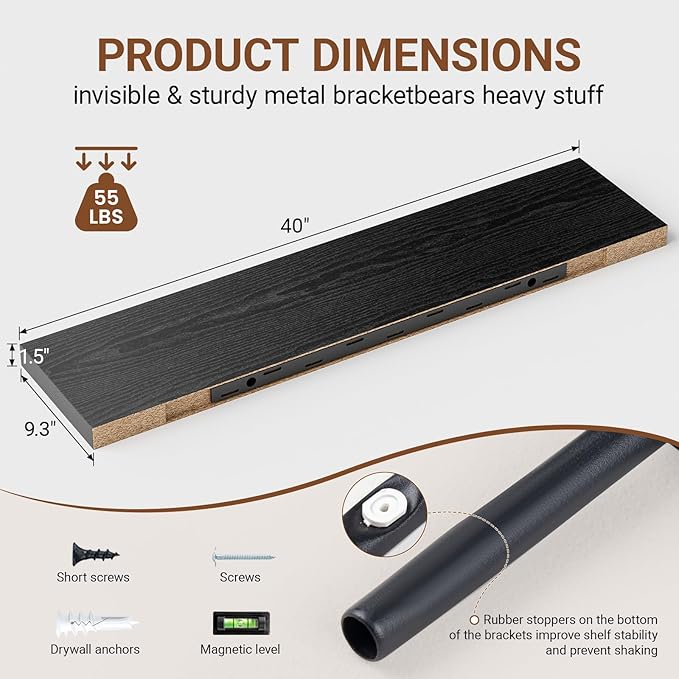 - 【Longer Design】Our pretty black wall shelves are 40"W x 9.3"D x 1.5"H.Our black floating shelves is longer than traditional designs and can hold more items.The black floating shelf optimize wall space,helping organize essentials without taking up floor space in your home.