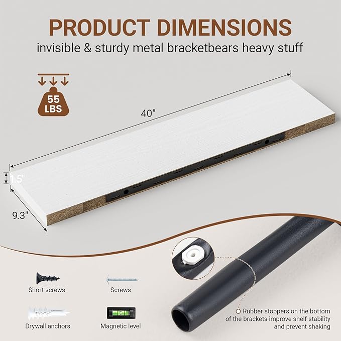 - 【Longer Design】Our pretty white wall shelves are 40"W x 9.3"D x 1.5"H.Our white floating shelves is longer than traditional designs and can hold more items.The white floating shelf optimize wall space,helping organize essentials without taking up floor space in your home.