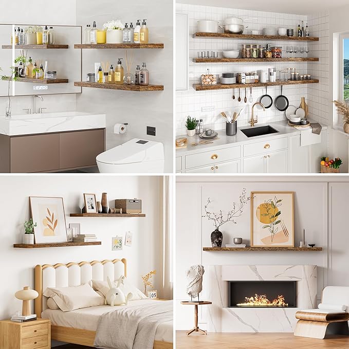 - 【Modern Rustic Look】Our 48 floating shelves for wall are made from durable engineered wood,which blends well with modern and rustic farmhouse wall decor alike.The 48 inch floating shelves is available in colors & sizes,perfect for storing books,plants,collectibles,etc..