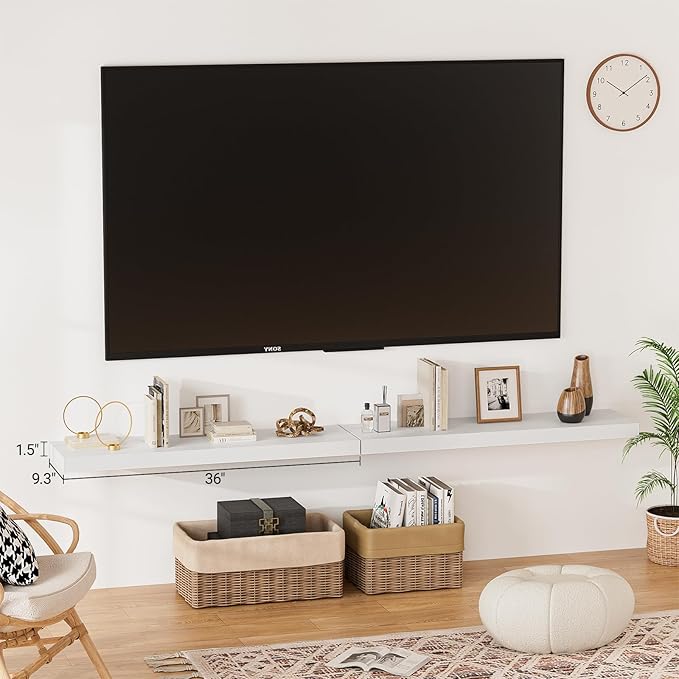 - 【Longer Design】Our pretty 36 inch wall shelves are 36"W x 9.3"D x 1.5"H.Our white floating shelves is longer than traditional designs and can hold more items.The 36 inch white floating shelf optimize wall space,helping organize essentials without taking up floor space in your home.