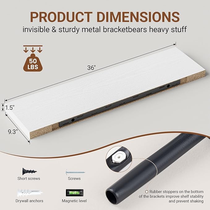 - 【Modern Rustic Look】Our 36 inch floating shelves for wall are made from durable engineered wood,which blends well with modern and rustic farmhouse wall decor alike.The 36” floating shelves white is available in colors & sizes,perfect for storing books,plants,collectibles,etc..
