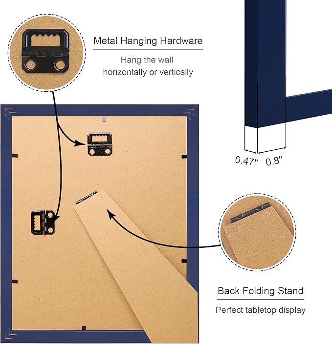 - Multiple Display:8 by 10 photo frames come with hanging hardware, which can be hung horizontally or vertically on the wall, or displayed on the tabletop through the stand