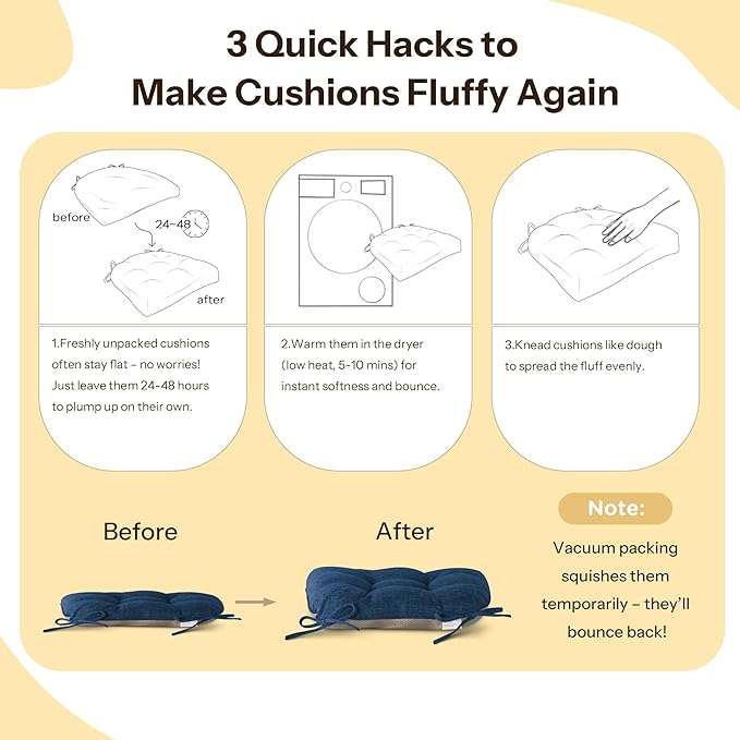 - Enhanced Support & Premium Filling: Our dining room chair cushions offer double the comfort with high quality cotton filling that offers superior comfort and support, relieving pressure on your hips and tailbone during extended seating. The chair cushions are tufted to prevent foam clumping. Perfect for extended sitting whether at the desk or dining table it combines comfort with ergonomic support.