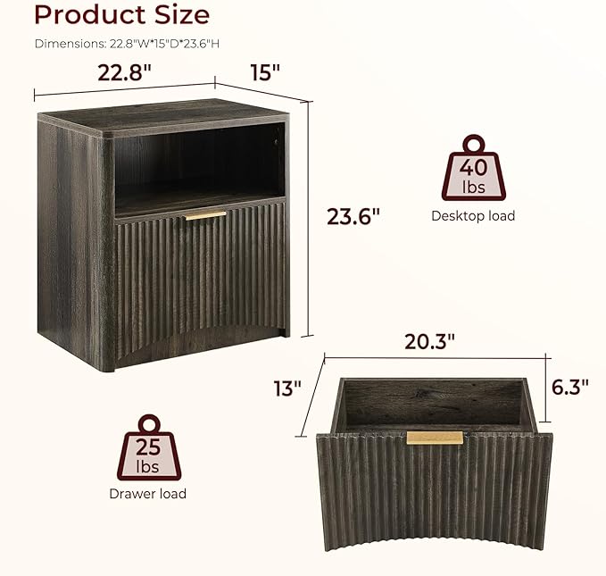 - 【Versatile Nightstand】This fluted nightstand with drawers combines an open upper shelf for easy access to essentials like books, with a lower drawer for concealed storage of personal items, offering a convenient solution for bedside organization