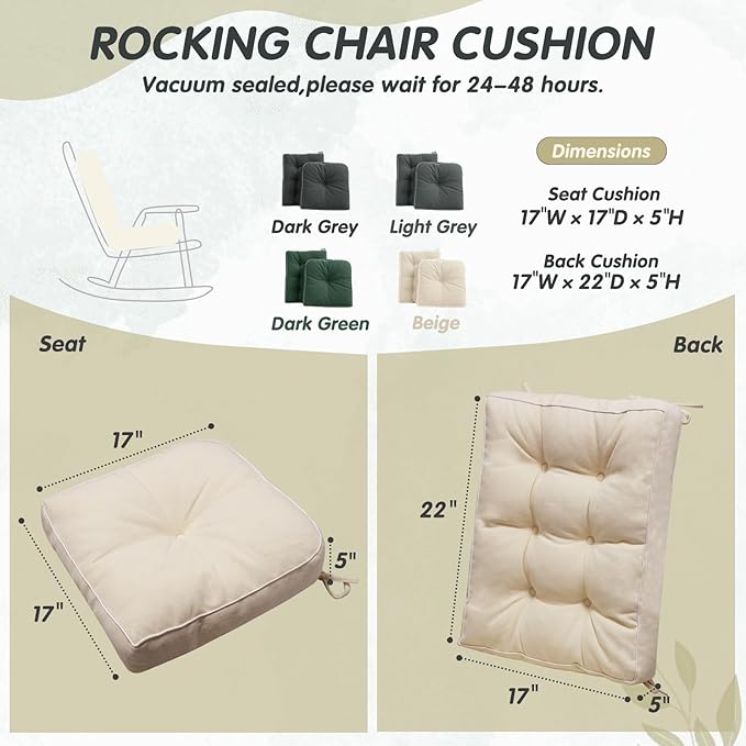- Ergonomic Design with Thick Cushions:Our rocking chair cushions feature a seat size of 17x17x5 inches and a backrest size of 22x17x5 inches, designed with ergonomics in mind. The 5-inch thickness provides unparalleled comfort, perfectly contouring to your body and effectively relieving pressure