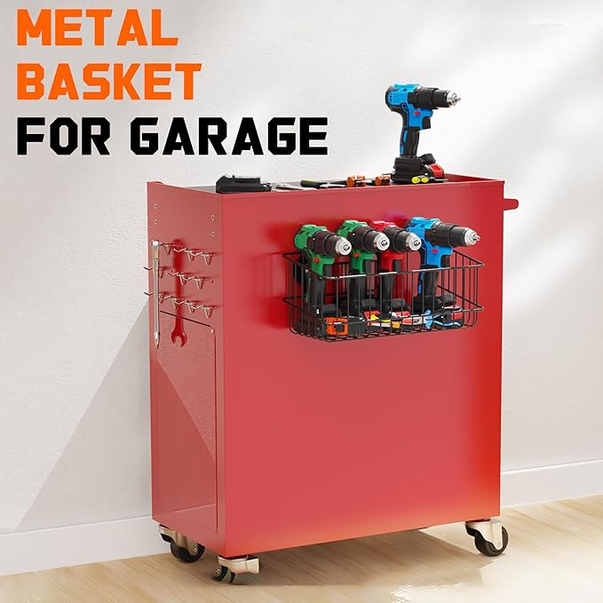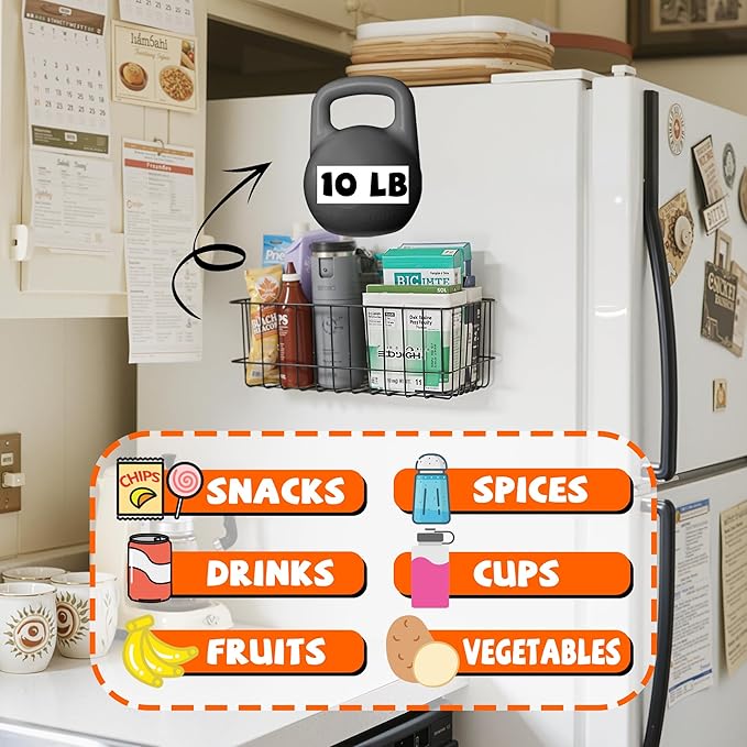 - [Heavy Duty Magnetic Basket]: Constructed with high-quality steel and powerful magnets, the metal shelf can securely hold 10 lbs on refrigerators and 24 lbs on other metal surfaces. Perfect for garage, laundry, kitchen pegboard, metal garden shed, cabinet