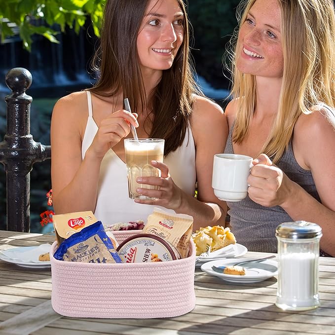 Small Woven Storage Baskets 12“X8”X5“ Decorative Rope Bins for Organizing Shelves, Closets, and Toys, Empty Gift Baskets, Cute Organizer Basket for Home and Office (pink, regular)