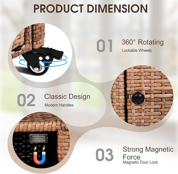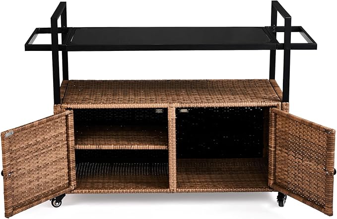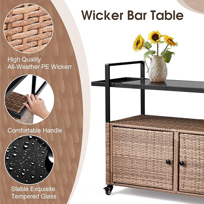 - VERSATILE STORAGE & MOBILITY: The Outdoor Patio Wicker Bar Counter Table showcases a tempered glass top, 4 wheels, and a large enclosed storage cabinet with 2 doors. Ideal for outdoor bars, this table affords generous space for serving, prepping, or storing items without hassle