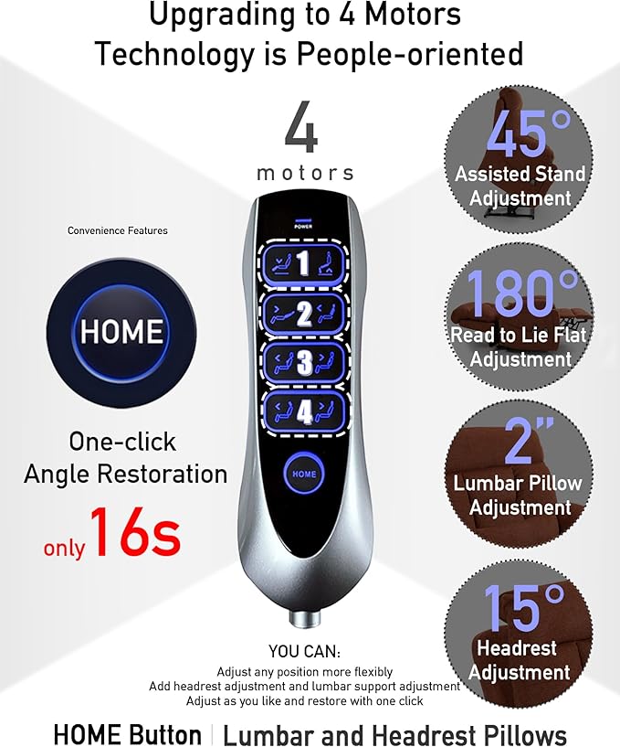 - This power recliner is controlled by a remote control with 4 built-in motor drives to adjust the backrest leg rest; compared to the general button control, it is more convenient, not affected by the sitting position, and lie flat recliner can provide a variety of applicable angles, the maximum expansion angle of 180 Β°, suitable for daily reading, watching TV, lying down to rest, power recliner backrest and leg rest can be independently adjusted to achieve wireless position!