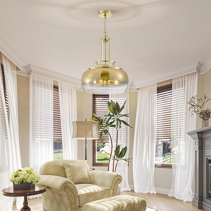 - Design: This rustic farmhouse Wuzups pendant chandelier light with design offers a modern interpretation of a classic urban-industrial style, which adds a vintage flair to your space. It comes in a gold finish and features a prominent round gold gradient glass shade that has pinprick bubbles that add to the vintage look and feel.