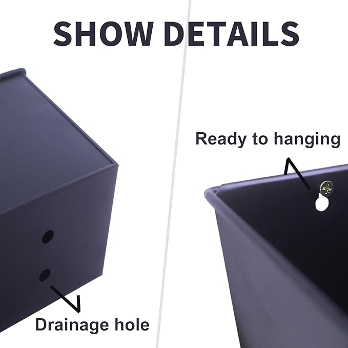 - Maximize Greenery Space with our outdoor wall planter’s slim rectangular design—ideal for tight spaces! The classic black finish blends seamlessly with garden wall art outdoor themes. Includes 6 hooks/screws for instant setup on siding, fences, or sunroom walls.