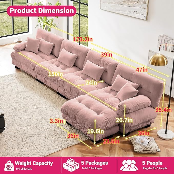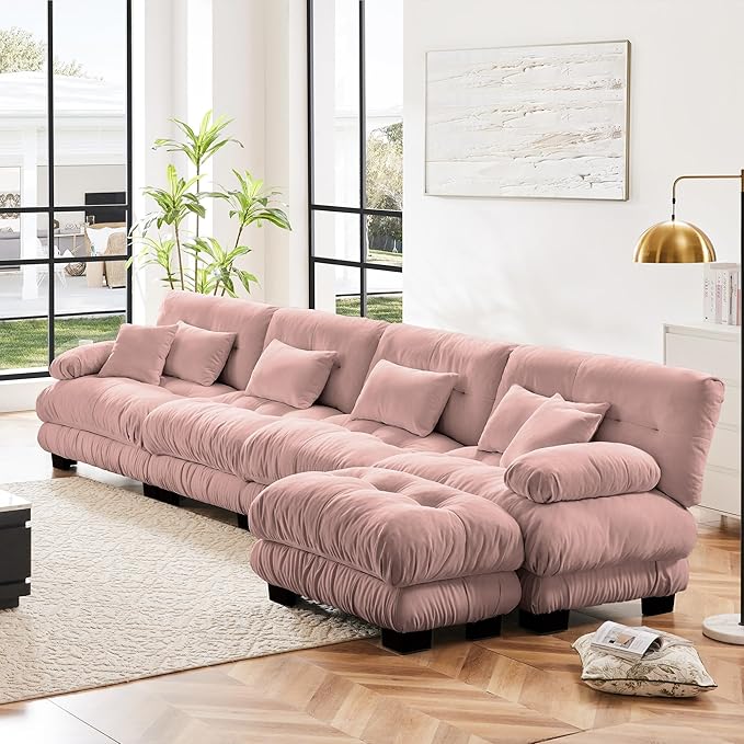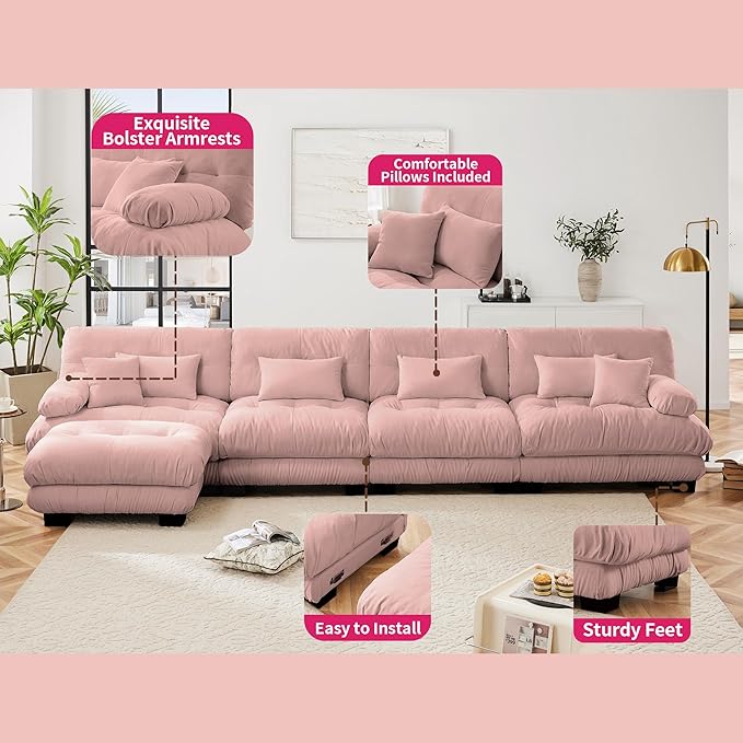 L Shaped Couch Sectional Couch, 4-Seater Cloud Couch Sectional Oversized Couch, Sofa Bed Couch with Round Bolster Armrests 6 Pillows, Modular Couch Home Sofa Living Room Couch(Pink)