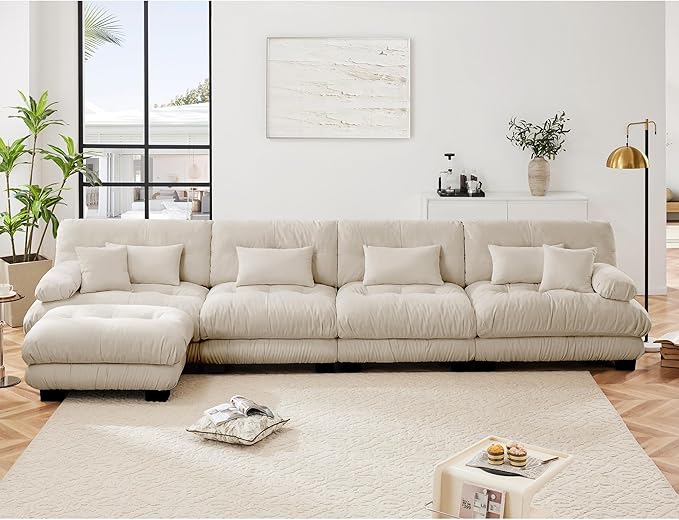 - Oversized L-Shaped Couch: This is a modern sectional couch with an ottoman. The 4-seater sofa couch is made of soft, durable, and exquisite vintage chenille fabric, it offers comfort and soft seating for everyone sitting on it. Exquisite round bolster armrest designs with well-filled inside provide comfort support for the hands, while sitting on it the bolster armrest can also provide your head with the appropriate radian and support